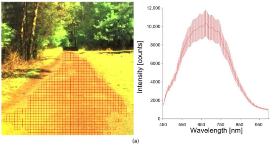 In the above-cited publication [3], the researchers set themselves the goal of determining the quality of plant vegetation. They determined that the optics of the hyperspectral camera has an enormous impact on the quality of the measurement, as has the pixel’s location in the image. However, this problem can be ruled out by calibration. In terms of the influence of the environment on the obtained spectra, they distinguished sources of interference: variable insolation, noise from the soil background, plant structure, or shadows.