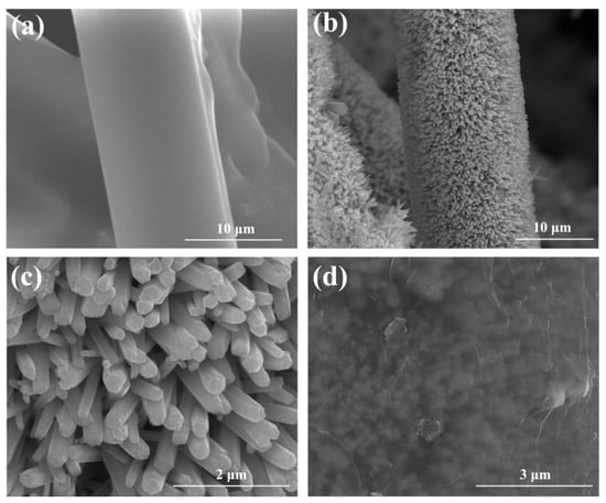 The SEM images of PET, PET/ZnO, and PET/ZnO@MXene are displayed in Figure 1. The PET fiber showed a smooth surface with a diameter of approximately 10 μm (Figure 1a and Figure S2). After hydrothermal processing, uniform and dense ZnO nanorod arrays were found to grow on the surface of PET, shown in Figure 1b. The high-resolution SEM image (Figure 1c and Figure S3) showed that the aligned ZnO arrays were hexagonal nanorods with a diameter smaller than 300 nm. According to the diameter change of the PET before and after ZnO growth, the length of the nanorod was estimated to be approximately 2 μm. After being impregnated with MXene nanosheets, the as-made PET/ZnO fabric displayed a rough and wrinkled MXene film on the surface in Figure 1d and Figure S4. The tight encapsulation of MXene nanosheets on the ZnO surface might be owing to the electrostatic interactions between the negatively charged hydrophilic MXene nanosheets and oxides, which is beneficial to promote electron transmission [].