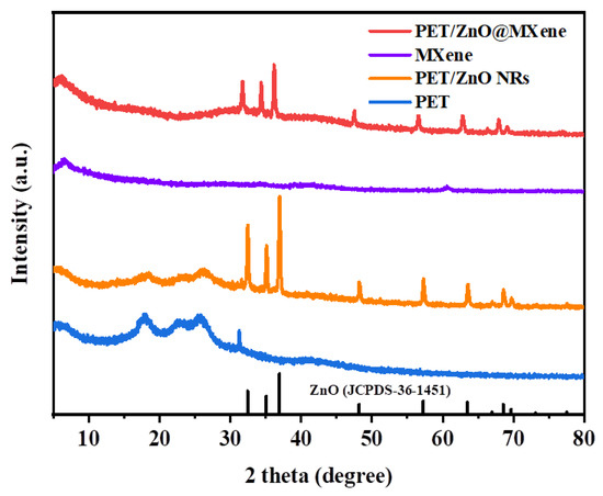 XRD patterns of PET, MXene, PET/ZnO NRs, and PET/ZnO@MXene composite fabrics.