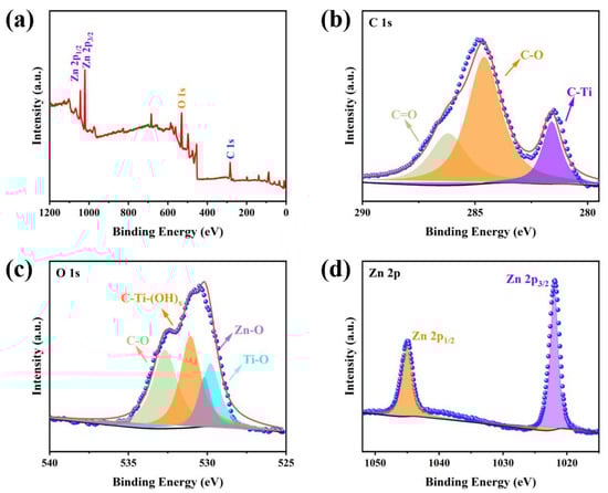 The chemical states and elemental compositions of PET/ZnO@MXene were analyzed by XPS. Shown in the full-survey XPS spectrum of PET/ZnO@MXene, the presence of Zn, C, O, Ti, and F elements is confirmed. Furthermore, the high-resolution spectra of the C, O, and Zn elements were analyzed. In Figure 3b, strong peaks with the binding energy of approximately 286.2, 284.6, and 281.6 eV could be attributed to C-O/C-N, C-C, and C-Ti bonding, respectively []. The high-resolution XPS spectrum of O 1s can be divided into four distinct peaks in Figure 3c, with binding energies of 532.7 eV, 531.1 eV, 530.2 eV, and 529.8 eV. The four peaks corresponded to the presence of C-O, C-Ti-(OH)x, Zn-O, and Ti-O, respectively [,,]. The high-resolution XPS spectrum of Zn 2p shown in Figure 3d displayed two fitted peaks at 1044.2 eV and 1021.1 eV, which were assigned to Zn 2p1/2 and Zn 2p3/2, respectively. These results indicate that on the surface of ZnO NRs, the chemical compound valence of Zn is in the positive divalent oxidation state [,,].