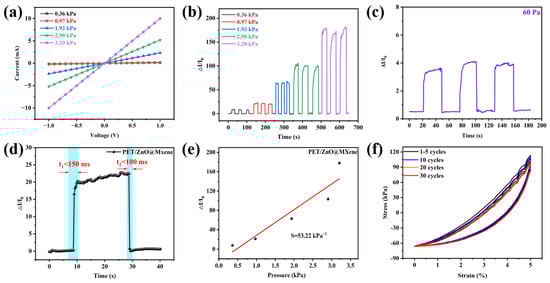 Electronic and sensing performance of a PET/ZnO@MXene flexible composite fabric pressure sensor. (a) I-V curve, (b) I-T curve under different applied pressures, (c) response change under P = 60 Pa pressure, (d) response recovery time under P = 0.97 kPa pressure, (e) linear sensitivity fitting diagram within the pressure ranges of 0.36–3.20 kPa, (f) strain–stress curve after 30 cycles under the strain of 5%.