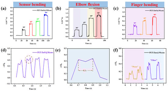 The developed pressure sensors can be used to track weak vibration or bending signals based on their sensitivity to minor deformation. We examined the sensor’s pressure-sensing capability towards various pressures. In Figure 4a, the I-V curves under different pressures showed that the sensor’s response to static pressure was stable (–1~1 V). The I-V curves exhibited good linear Ohmic contact behavior, with the resistance value (slope of the I-V curve) remaining constant under the applied pressures of 0.36, 0.97, 1.93, 2.90, and 3.20 kPa. The I-V curve’s slope increases as the strain increases, implying that the resistance of the composite increases as the pressure increases. In the following tests, the voltage value was set as 1 V. In Figure 4b, the sensor exhibited an obvious response under different strains, and the response value increased with the increase in strain. Additionally, the dynamic response and recovery curves of the flexible pressure sensor based on PET/ZnO@MXene achieved almost the same response value within five measurement periods under each strain, indicating that the sensor has good recycle stability. In addition, a clearly discernable current change signal appeared even under the pressure of 60 Pa as shown in Figure 4c, indicative that the flexible pressure sensor based on the composite fabric has a low detection limit.