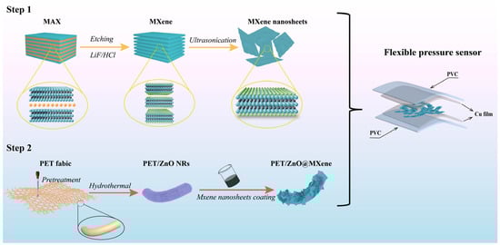 Large pieces of fabric were cut into 2 cm × 2 cm pieces and treated ultrasonically in methanol, acetone, and deionized water solutions for 10 min to obtain a clean PET flexible fabric. Then 0.02 g of zinc acetate dihydrate was dissolved in 20 mL of anhydrous ethanol and stirred at 600 rpm for 30 min to form a transparent solution. One milliliter of the zinc acetate solution was added to the flexible PET fabric base and dried in the atmosphere. This adding–drying step was repeated 4–5 times. The as-made flexible material was then treated at 350 °C for 20 min. Meanwhile, zinc nitrate hexahydrate (0.745 g), polyetherimide (PEI, 0.4 g), and hexamethylenetetramine (HMTA, 0.35 g) were dissolved in 100 mL of deionized water and stirred at 600 rpm for 30 min. The pre-treated PET fabric material was then inverted in the configured growth solution and hydrothermally reacted for 4 h at 90 °C. The obtained PET/ZnO NRs flexible fabric was repeatedly dipped into the 1 g/mL of MXene nanosheets aqueous solution, and this step was repeated 5 times to obtain a uniformly coated PET/ZnO@MXene fabric. The copper films were attached as electrodes to both ends of the PET/ZnO@MXene flexible fabric, and two clean flexible PVC films covered the two ends of the pressure-sensitive device to prevent material contamination and ensure the stability of the equipment during the test. The picture of the fabricated sensor is shown in Figure S1. Scheme 1 is the synthesis diagram of the PET/ZnO@MXene composite fabric.