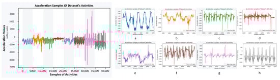 This figure shows examples of the signals that represent each class of the Skoda Public dataset with different colors. Starting from left to right (a) Notepad, (b) Open close hood, (c) Gaps front door, (d) Open close left door, (e) Close both left door, (f) Check trunk gaps, (g) Open close trunk, (h) Steering wheel. For all the activities, samples are taken from the X-axis accelerometer on the right hand. The activities of the “open hood” and “close hood” as well as the “open left door” and “close left door” are displayed together as “open close hood” and “open close left door”, since they are always consecutive. The acceleration is provided in milli-g units.