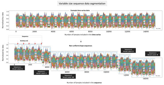The analyzed data for our research are sequences of varying length annotated with weak labels that serve as targets for the machine learning models. Traditional approaches for handling time-series data often involve dividing the data into fixed window lengths. However, due to the high variance in activity durations, using a small window for a long activity or a large window for a short activity can result in the loss of important information []. Up until recently, one commonly used approach required very large window samples that could fit all activity sizes inside, padding them with a value (typically zeros) and feeding them as input to the networks. Annotating data, on the other hand, is usually laborious and time-consuming, and requires considerable attention and precision.