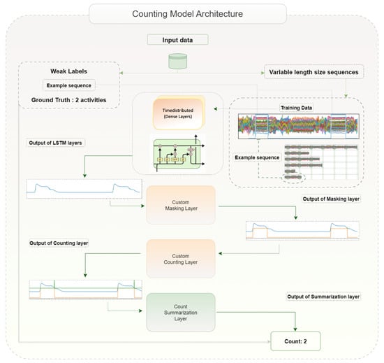 As an overview of the challenges motivating this work, we concentrate on the following: (i) spread of valuable information across consecutive sequences, (ii) information loss caused by using a single, fixed window size for varying-duration activities, (iii) limited flexibility of models that are more specific for particular data due to manual preprocessing methods, and (iv) the topic of data annotation. To address the aforementioned issues, we propose a model design that works with (i) variable length of data as input, (ii) data that have some form of annotation but is not completely annotated, known as weakly labeled, (iii) raw calibrated data that are normalized but not subjected to any further filtering, to reduce complexity, simplify the preprocessing stage, and develop a more robust model in unprocessed data to achieve counting, (iv) the implemented counting method, integrated within the model’s training process rather than simply incrementing the count of correctly classified instances, and (v) fewer training parameters than existing model architectures in the literature to enable suitability for deployment on devices that have limited processing and power resources. Our approach aims to improve the model’s ability to accurately count the activities performed by a user, rather than just detect them. To the best of our knowledge, this is the first study that investigates the counting of completed activities and tasks, in a way that goes beyond counting the quantity of previously correctly recognized activities from a classifier, employing an LSTM [] for counting patterns in a sequence.