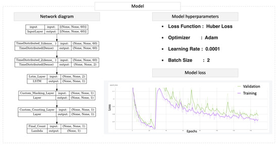 From left to right, this image presents the network’s diagram of the counting model with the input (60 acceleration signals) of variable length and output of 1 number. Moreover, the hyperparameters include Huber loss, ADAM optimizer, a learning rate of 0.0001, and a batch size of 2. An example of a learning curve for the training and validation sets demonstrates the model’s performance during training. The x-axis represents the number of training epochs, while the y-axis represents the loss metric.