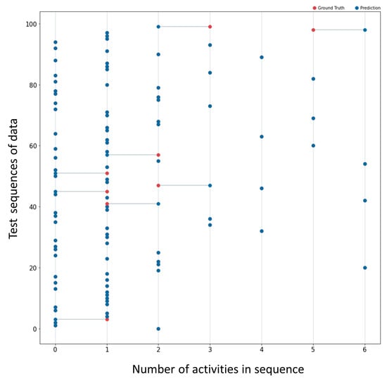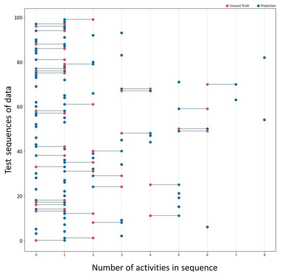 The figure presents the ground truth (red dots) and prediction (blue dots) of the model for 100 unseen sequences of data. The input data are from the steering wheel activity of the Skoda dataset. The algorithm for counting predicted accurately 60 out of 100 activities. A line connecting the two numbers shows the difference in the incorrectly predicted sequences. The largest error per sequence observed in the graph is 1 count.
