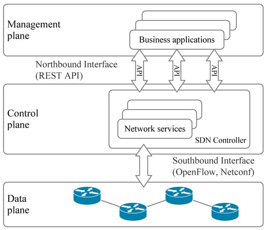The software-defined network (SDN) is an emerging network architecture whose core idea is to decouple the control layer from the data layer to achieve the centralized control of hardware devices. The controller performs the management, control and decision-making processes of the switch, and the switch is only responsible for data forwarding, making the network structure flexible and efficient. The concept of OpenFlow technology was first proposed by Professor Nick McKeown of Stanford University []. Using OpenFlow as the southbound interface protocol for SDN enables effective interaction between controllers and switches. OpenFlow is currently the most widely used southbound interface protocol for SDN. The controller controls the forwarding mechanism of the switch through the formulation of flow table rules. Certain blocking of DDoS attacks is performed to ensure normal communication, as shown in Figure 1.