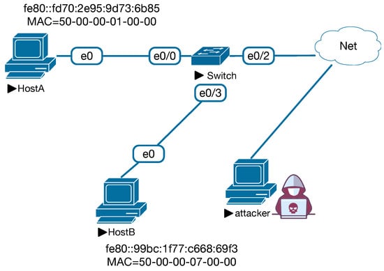 Host A needs to resolve the link layer address of Host B before sending a message to Host B. The nodes on the link use the neighbor request message and the neighbor advertisement message to create an IP-MAC mapping relationship in the neighbor cache table, so Host A sends an NS message where the source address is the IPv6 address of Host A, the destination address is the multicast address of the requested node of Host B and the destination IP to be resolved is the IPv6 address of Host B. It also carries its own MAC address. Moreover, in message sending, a record of the recipient IP is created in its cache, and it sets its status to incomplete. When Host B receives the NS message, it verifies whether the NS message is received by verifying the multicast address and IP address of the requested node. If successful, Host B will extract the source address and the source link layer MAC address in the message option, form a mapping relationship, add or update it in the local neighbor table and then carry its own MAC address and IP address to send the NA message with the destination address as a unicast address to the requester. After Host A node receives the NA message, it updates its own neighbor table according to the IP-MAC mapping relationship based on the MAC address carried in the option. Its status is Reachable. While awaiting NA messages, Host A updates its own neighbor table status to Stale if it times out. Because the NS message is sent out as a multicast, other nodes on the multicast can also receive the relevant information and know the MAC address of the source node, and the destination node enables the request flag S when responding to the NA message to the source node, so when the attacker “sniffs” the NS message, obtains the IPv6 address of the source node and performs a DDoS on the address, it obtains the address of the source node and performs a DDoS attack on this address. This causes the neighbor cache table to overflow, and Host A and Host B cannot communicate normally. This is shown in Figure 2.