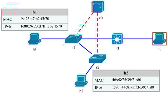 In this study, the NS flooding attack network is built in the EVE-Ng [] environment, as shown in Figure 2. Host A and Host B are normal hosts, and Kali is connected to the external network as the attacking host. The NS flooding defense environment is built on Ubuntu Linux with the SDN architecture, where the SDN architecture includes the RYU [] controller, Mininet emulation and an OpenFlow flow table, and the switch uses Open vSwitch. In the defense emulation environment, H1 and H2 are normal hosts, H3 is the attacking host that initiates the sniffing message operation and flooding attack on H1, which sends the Ping command, and the generated flow table entries are extracted from switch S1 through controller C0 and analyzed and re-issued as rules to the switch. This is shown in Figure 5.