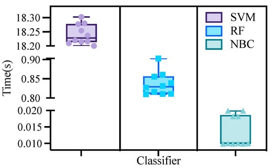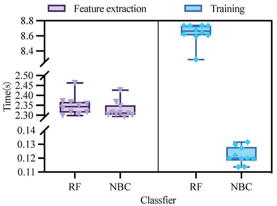 In the next experiment, the original dataset was compared in terms of both feature extraction time and data processing time by the RF algorithm and NBC algorithm. The feature extraction time and data processing time of the two algorithms are shown in Figure 8. From the figure, we can see that the feature extraction efficiency of NBC is slightly higher than that of RF, but the average time is shorter than that of RF, and both achieve high stability. For the training times of RF and NBC, NBC leads RF, with a faster rate. Therefore, from the above results, the NBC algorithm, with high accuracy, a short training time and a stable training model, is selected in this paper.