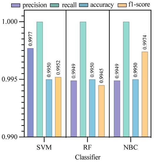 The processing of the datasets is mainly used to distinguish the traffic as normal traffic and abnormal traffic and to perform binary classification on the original datasets. The most common linear classifiers include NBC and SVM [] algorithms. NBC is suitable for dealing with text-based classification, where the attack dataset features contain a certain amount of text, which is more effectively processed using NBC. SVM is a machine learning algorithm used to solve the binary classification problem, which has certain advantages in dealing with small sample datasets and has a strong generalization capability. In addition to linear classifiers, for multiple features in the dataset, we consider the non-linear classifier RF for comparison with linear classifiers.