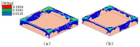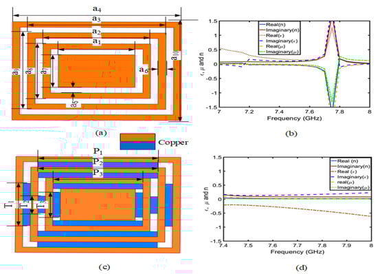 Firstly, Figure 2a,c shows a copper ring without embedded microstrip lines (CRO) and a copper ring with embedded microstrip lines (CRW). The above two rectangular copper rings are symmetrical in structure, and the gap and microstrip line width are the same. Table 1 shows the parameter sizes of the two copper rings. Figure 2b,d shows the real and imaginary parts of the permittivity (), magnetic permeability (), and refractive index (n), which are approximately equal to zero by periodic electrical boundary (PEC) and periodic magnetic boundary (PMC) simulation results, which is obtained using Equations (1) and (2). The CRO and CRW belong to the NZIM. However, the coil without an embedded microstrip line (CRO) only belongs to the near-zero-index metamaterial at 7–7.6 GHz, while the inclusion of an embedded microstrip line (CRW) can improve the near-zero-index condition near 7.8 GHz.