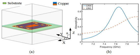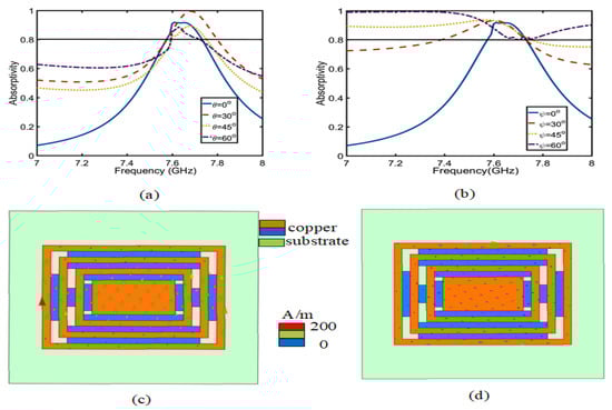 Secondly, Figure 3 shows the comparative absorption of CRO and CRW and the simulation model of CRW. The CRO and CRW is simulated by applying Floquet port and periodic boundary conditions in Ansys HFSS, and the absorptivity is obtained using Equation (3). In Figure 3b, the absorption of CRW is much better than that of CRO, and the absorption rate reaches 92% at 7.6 GHz. In the case of CRW, as the radiation surface of the button antenna has a certain slope, the slope absorption angle (() and ()) and absorption efficiency should be simulated in Figure 3a. Figure 4a,b shows that () is the absorption rate after the change in the YZ slope angle, and () is the absorption rate after the change in the XY slope angle, which is the slope absorption rate of the CRW structure via PMC and PEC simulation. The slope angles vary from 0 to 60 with a step size angle of 15. It can be observed that the proposed absorber material structure exhibits a different response at 7.6 GHz. The same absorptivity exists for different polarization angles (0, 30, 45). However, when the incidence angle is 60, the absorption rate begins to decrease, which is related to the resonant current at the resonant frequency. As shown in Figure 4c,d, the current density at an angle of 60 significantly decreases, where red indicates the strong concentration and blue indicates the weak one. Because of the change in the absorption current of the  = 60 angle, the absorption rate is in the complete absorption state.