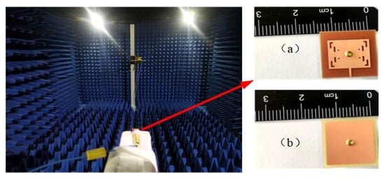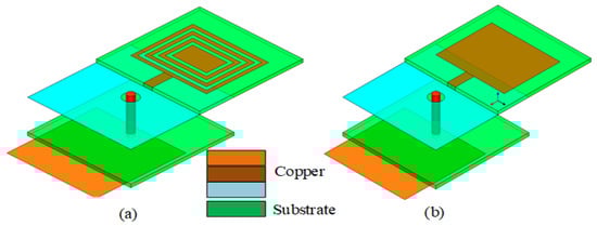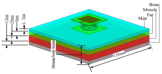 As shown in Figure 1, the overall size of the antenna is 15 × 15 × 5 mm3, where the grounding and feed isolation aperture is 2 mm and the coaxial feed diameter of the antenna is 1 mm. The antenna is composed of two substrates of glass fiber epoxy (FR-4) material. The FR-4 material has the advantages of a simple structure, easy fabrication, and good physical characteristics, meaning that the antenna radiation is not constrained by its own shape, allowing it to realize a stability of radiation. The permittivity of these substrates is 4.4, with a tangential loss of 0.027 and a thickness of 1.5 mm. A coaxial feed link is used to connect the parasitic patch and radiation patch to reduce coupling and impedance matching. The parasitic patch makes the antenna reach its maximum gain with a size of 13 × 13 mm2.