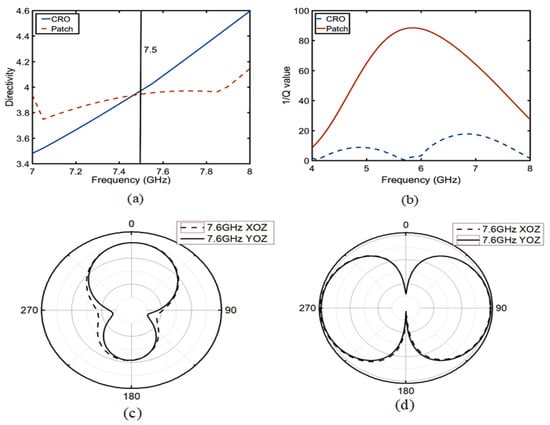 In the equivalent circuit of the patch antenna, D is a directivity coefficient, which is defined as the ratio of the radiation intensity of the antenna in the maximum radiation direction to the average radiation intensity. The quality factor Q is a parameter that measures antenna bandwidth and gain. As shown in Equations (4) and (5), both are inversely proportional to the radiation conductance Gr; the other parameters are known numbers. Then, as shown in Figure 6, when the electromagnetic field model conforms to the  mode and  (a is the length of the antenna and  is the free space wavelength), Q and D become positive, as shown in Equation (6). The results are shown in Figure 7a,b. After 7.6 GHz, the values of D and Q of the CRO antenna increase relative to the patch antenna, wherein the radiation direction of the co-polarization changes throughout Figure 7c,d. The change in the Q value is greater than that observed in D, so it is very important to study Q.