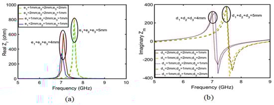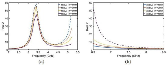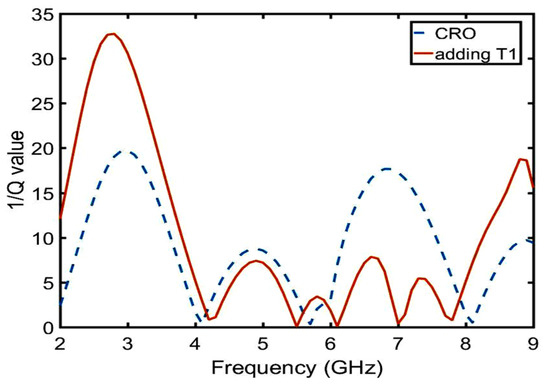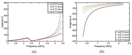 After calculation, the following conclusion can be drawn:  is inversely proportional to the real part of the impedance from 2 to 5.5 GHz in Figure 12a, which belongs to the -type circuit; and  is directly proportional to the real part of the impedance from 6.5 to 8.5 GHz in Figure 12b, which belongs to the T-type circuit. In the same way, the relation between the imaginary part of the impedance and the length of  was calculated using Equations (21)–(23) and is shown in Figure 13. The conclusions are as follows:  is proportional to the imaginary part impedance of the T-type and inversely proportional to the imaginary part impedance of the -type. As shown in Figure 14, when  continuously increases, the imaginary part of the impedance frequency from 2 to 5.5 GHz gradually decreases. Therefore, it is determined that this property belongs to a -type circuit. In the same way, it belongs to a T-type circuit at 6–8.5 GHz. As shown in Figure 15, after adding , Q is not improved at 2–5 GHz, whereas Q is greatly improved at 6–8 GHz. Therefore, the parameters of , , , , and  are optimized based on a T-type circuit.