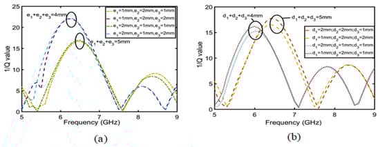 The change in the Q value can affect the gain of the whole antenna. Therefore, to improve the gain of the CRO antenna, we should first analyze the factors in the CRO structure that can affect the Q value, determine which factors have the greatest influence on Q value, and finally adopt the methods that further improve the Q value to increase the antenna gain. As shown in Figure 8, it is assumed that the copper coil in the CRO structure is the real part of the impedance and that the coupling between the coils is the imaginary part. Equation (7) is used to calculate the relationship between the Q, copper coil, and coupling distance. Therefore,  is the coil width and  is the coil coupling distance. Equation (8) is established based on the principle of the microstrip line between the width of copper coil and the real part. Equation (9) is established according to the parallel relation of the real part in Figure 8, and Equation (10) is substituted into Equations (8) to obtain Equation (9); in this way, the relationship between the coil width  and the real part of impedance was obtained. When  (h is the height of the coil),  is proportional to the sum of  in the frequency range of 5–8 GHz, as shown in Figure 9a. Similarly, the relation between the coupling distance and imaginary part can be calculated using Equations (11) and (12). It can be concluded from Equation (12) that the imaginary part is proportional to the sum of the coupling distance . The imaginary part and coupling distance shown in Figure 9b also conform to this relation. Substituting Equations (10) and (12) into Equation (7), we obtain Equation (13), which is the relationship between quality factor Q and the coupling distance  and coil width . The value of Q is proportional to the sum of the coil widths and is inversely proportional to the coupling distance. Therefore, increasing the coil width  can further improve the Q value. As shown in Figure 10, the increase in the coil width  is much greater than the decrease in the coupling distance .