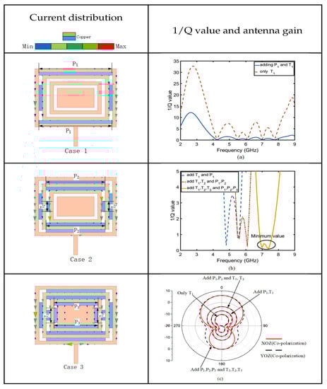 CRW analysis: adding the  current distribution (case 1); adding the  and  current distribution (case 2); adding the  and  current distribution (case 3); comparison diagram of 1/Q after adding  (a); the minimum value of 1/Q after CRW optimization (b); maximum gain after CRW optimization (c).
