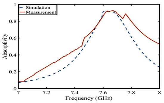 For wearable applications, the SAR value is a critical parameter. The numerical SAR distributions of the proposed antennas are shown in Figure 19. The calculation is based on the IEEE C 95.3 standards, and the simulated power is 200 mW. According to the European standard, the SAR results should be under 2 W/kg averaged over 10 g of tissue. As shown in Figure 19, (a) the SAR peak value is 0.18 W/kg at 7.6 GHz and (b) the SAR peak value is 0.10 W/kg at 7.8 GHz, both of which meet the standard. The absorption efficiency is calculated by measuring the S-parameter of the antenna radiation surface. The absorption efficiency measurement is basically consistent with the simulation in Figure 20. In Table 2, compared with other button antennas, this button antenna has a smaller SAR and has less influence on body tissues.