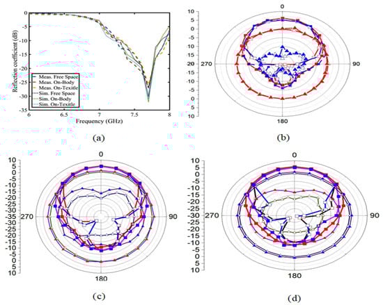 (a) is the  simulation and measurement diagram. (b–d) are the radiation simulation and measurement of the button antenna on the free space, on-body, and on-textile regions. (□ is the co-polarization simulation XOZ, ▪ is the co-polarization measure XOZ, □ is the co-polarization simulation YOZ, ▪ is the co-polarization measure YOZ, ▵ is the cross-polarization simulation XOZ, ▴ is the cross-polarization measure XOZ, ▵ is the cross-polarization simulation YOZ, and ▴ is the co-polarization measure YOZ).