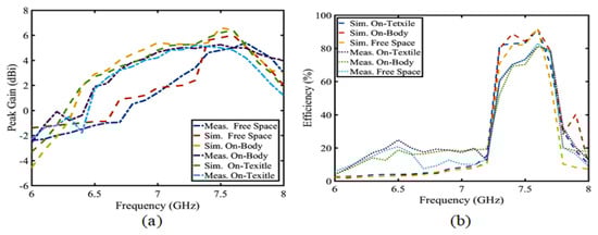 As shown in Figure 21, (a) is the S-parameter value of the button antenna in different wearing substances, such as free space, arms of the human body, and cloth textiles. Judging from the S-parameter, this does not have much influence on the body tissue and clothing textile. The effect of the antenna radiation on the free space, human body, and cloth textiles is shown in Figure 21b–d. Although the human body and clothes improve antenna radiation and gain, the increase is 0.1 dBi. That is, it has no effect on the antenna radiation itself. As shown in Figure 22, other peak gains and the efficiency are unchanged, so wearing the button antenna with different substances has no influence on the performance and absorption. Compared with other button antennas, this button antenna has a small size, high gain, and good efficiency, as shown in Table 2. In other words, the antenna provides a good stable performance.