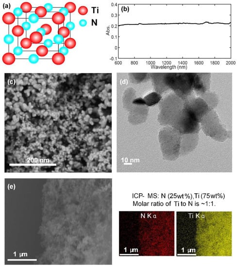 Material characterizations of the TiN sample. (a) Face−centered cubic structure. (b) Optical absorption behavior. (c) SEM image. (d) TEM image. (e) EDX mapping of the as−synthesized TiN NPs.