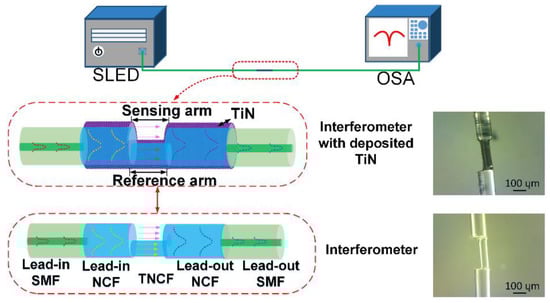 To evaluate the effect of TiN deposition on the RI response enhancement of the fiber optic interferometer, an experimental setup was built up, as indicated in Figure 2. During the test, the two ends of the TiN-incorporated interferometer were connected with the broad-bandwidth SLED light source (Fiberlake Co., Ltd., Shenzhen, China, WBB400008SFA) and the optical spectrum analyzer (OSA, Yokogawa Co., Ltd., Tokyo, Japan, AQ6370D). When the system works, the OSA resolution is set as 0.1 nm, and the incident light launched from the SLED transmits into the interferometer. The excited evanescent wave interacts with the deposited TiN, and it generates a strong light–TiN interaction. As a result, the optical properties of the fiber are modulated, which modifies the transmission spectrum of the interferometric light. Finally, the transmission spectra were experimentally acquired for the discussions.