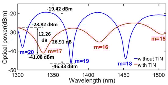 Next, the other parameters, including insertion loss, fringe contrast ratio, and figure of merit, are discussed. Firstly, the insertion loss becomes higher after TiN NPs are deposited, and it increases from 19.42 dB to 28.82 dB. This result can be explained by the deposited TiN NPs absorbing an extra part of the evanescent wave energy, which increases the transmission loss. Secondly, the fringe contrast ratio is also modified after TiN deposition, and it decreases from 26.91 dB to 12.26 dB. This result can also be explained by the light absorption caused by the deposited TiN NPs, which adjusts the optical power ratio between the sensing arm and reference arm of the interferometer, resulting in the modulation of the fringe contrast ratio. Finally, the figure of merit (FOM) is determined by the full width at half maxima (FWHM) of the spectrum. In Figure 3, the FOMs show varying degrees of deterioration due to the FSR enlargement. Despite that, the spectrum after TiN deposition still exhibits enough high resolution for resonant wavelength location.