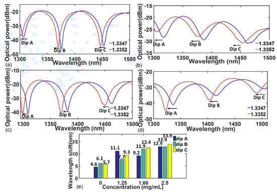 In addition, from Figure 4b–d, we can also observe a clear trend—that a larger TiN concentration leads to a more significant wavelength shift. The specific wavelength shift values of different interference dips are summarized in Figure 4e. The average wavelength shifts were determined to be 5.5 nm, 9.4 nm, 11.2 nm, and 13.2 nm for different TiN concentrations of 0, 1.25, 1.66, and 2.5 mg/mL, and several conclusions can be summarized. Firstly, the wavelength shifts of the three interference dips are enhanced, which confirms that deposited TiN NPs exhibit good optical absorption properties within a wide near-infrared spectrum range. Secondly, a larger TiN concentration means a larger probability of effective deposition of TiN onto the fiber surface. As a result, the volume fraction of TiN NPs increases, which leads to a rise in overall effective RI of the hybrid sensing layer and a smaller effective RI difference Δn of the interferometer. Finally, according to Equation (1), a more significant RI-induced wavelength shift can be observed.