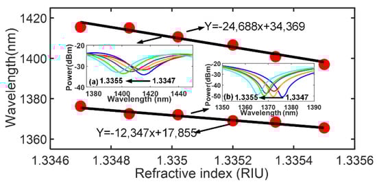 In the following part, the TiN-incorporated interferometer with a concentration of 2.5 mg/mL was selected, and dip B Figure 4 was taken as an example to evaluate the specific RI response sensitivity. The different RI solutions (1.3347~1.3355 with an increment of approximately 0.00016) were prepared for the RI sensitivity test, and the results are shown in Figure 5. The increase in the ambient RI leads to the decrease in the effective RI difference of the interferometer. As a result, it shows the blue-shift of resonant wavelength according to Equation (1). The RI response sensitivity of the bare interferometer is 12,347 nm/RIU, while it improves to 24,688 nm/RIU for the TiN-incorporated interferometer, which is approximately twice that of the bare interferometer. This result confirms that the RI response sensitivity can be effectively improved by incorporating TiN nanolayer. The enhanced RI sensitivity significantly improved over the previously reported fiber optic RI interferometers/nanomaterial-coated fiber optic RI sensors, and Table 1 shows the performance comparison.