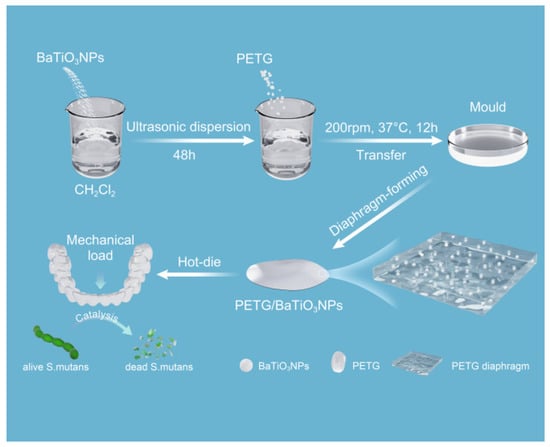 Malocclusion is a developmental disorder of the craniofacial complex that affects the jaws, tongue, and facial muscles and is known as one of the three major oral diseases that affect human oral function, aesthetics, social interactions, and health-related quality of life []. Malocclusion represents a high prevalence, ranging from 20% to 100%, as reported by different researchers [,,,]. Several studies have indicated that fixed orthodontic treatment can have adverse effects on the oral health of patients with malocclusion. These effects can range from mild to severe and include issues such as enamel demineralization, white lesions, caries, periodontics, and halitosis [,,]. Consequently, traditionally fixed orthodontic treatment is no longer adequate for meeting the orthodontic needs of modern patients. Aesthetic considerations play a crucial role in the practice of dentistry. In addition, studies have shown that thermoplastic invisible orthodontic aligners pose fewer risks to oral hygiene compared to traditionally fixed orthodontic treatments [], which has resulted in the thermoplastic invisible orthodontic appliances being widely used in the field of orthodontics. Thermoplastic invisible orthodontic aligners are produced through a process that involves heating thermoplastic sheets and molding them onto dental cast models using either vacuum or pressure forming. Several thermoplastics, such as polyethylene, polycarbonate, polypropylene, and polyethylene terephthalate glycol-modified (PETG), are presently utilized for the preparation of these appliances [,,]. Notwithstanding their benefits, thermoplastic, invisible orthodontic appliances tend to promote bacterial colonization. Sibel Tektas et al. found that cariogenic bacteria such as S. mutans and Lactobacillus were more likely to accumulate on the surface of macromolecular, invisible appliances when observed under an electron microscope []. Moreover, extensive literature suggests that during the course of invisible orthodontic treatment, these appliances remain in contact with the tooth surface for prolonged periods, impairing the self-cleaning mechanism of the teeth and increasing the risk of bacteria-related conditions, including enamel demineralization, dental caries, and periodontal disease [,,].