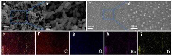 (a,b) SEM images of BaTiO3NPs; (c,d) SEM images of the cross-section of PETG/BaTiO3NPs (30 wt%) composite; (scale (a) = 200 nm; (b) = 100 nm; (c) = 500 nm; (d) = 200 nm); (e–i) element mapping for C, O, Ba, and Ti.