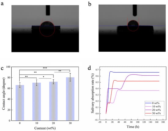 (a) Water contact angle image of PETG/BaTiO3NPs (0 wt%). (b) Water contact angle image of PETG/BaTiO3NPs (30 wt%). (c) Measurement results of PETG/ BaTiO3NPs (0 wt%, 10 wt%, 20 wt%, 30 wt%) water contact angles; (d) salivary dissolution rates of PETG/BaTiO3NPs (0 wt%, 10 wt%, 20 wt%, 30 wt%). (* p < 0.05, ** p < 0.01, *** p < 0.001).