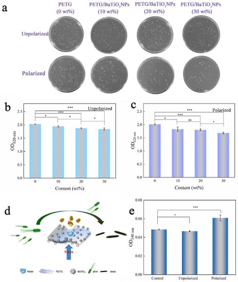 (a) Photographs of Streptococcus mutans colonies on the agar plate of unpolarized and polarized PETG/ BaTiO3NPs (0 wt%, 10 wt%, 20 wt%, 30 wt%); (b,c) Quantitative results of surface biofilm of the unpolarized and polarized PETG/BaTiO3NPs (0 wt%, 10 wt%, 20 wt%, 30 wt%); (d) Schematic of the antibacterial principle of polarized composites; (e) Quantitative results of intracellular ROS concentration. (* p < 0.05, *** p < 0.001, ns = no significance).