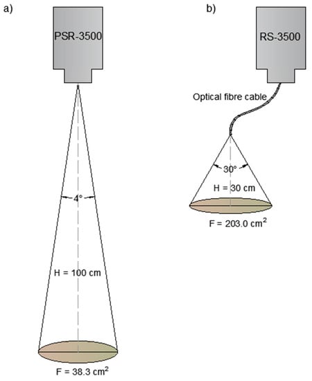 Areas scanned by the 4° lens with PSR-3500 Spectral Evolution spectrometer (a) and by the bare fibre optic with RS-3500 Spectral Evolution Spectrometer (b).