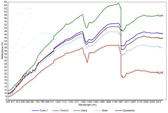 The mean spectra for each site are presented in Figure 3. All VIS-NIR spectra were similar in both shape and peak localisation. Despite the difference in texture (Table 1), Czesławice mean spectra is also similar to the other site spectra. This is probably due to the soil moisture hiding features related to clay and silt. There was a reflectance increase with increasing wavelength (from 350 to 1350 nm). In the visible range (350–780 nm), the reflectance is mostly associated with iron from minerals and soil chromophores from organic matter []. The shape of the spectra in that visible region did not change significantly, and it is probably the result of different water content. The water absorption from –OH bonds is visible at 1400 nm. The 1900 nm peak was deleted during the pre-processing stage due to the very strong noise related to soil moisture (strong water absorption in that region and noise from atmospheric water vapor []). Some small peaks are visible at around 2200 nm and 2300 nm and are related to clay minerals []. The main differences were observed in the baselines and peak intensity due to the moisture variations, and probably also due to the C content and the texture differences between the sites. The spectra are typical for wet mineral soils []. A more detailed study of the spectra could be undertaken on an individual spectrum rather than a mean spectra as more distinct absorption features are observable, but this is not the focus of this paper. It was also observed that measurements (spectra) located where the moisture content was more heterogeneously distributed in the field presented more variations and more noises. This underlined, one more time, the disturbing effect of soil moisture on the spectra. This is caused by light absorption by the water, which can cause spectral variations as described in [].