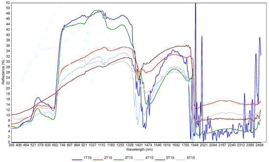Spectral variation related to moisture content at Turno 2 site. These are spectra taken at the same point at different scanning sessions. The moisture contents were: 1T15—25%; 2T15—19%; 3T15—20%; 4T15—15%; 5T15—7%; 6T15—9%. Numbers from 1 to 6 indicate the sampling dates; T indicates Turno 2 study site; and 15 indicates sample point no. 15 from the 36 grid points.