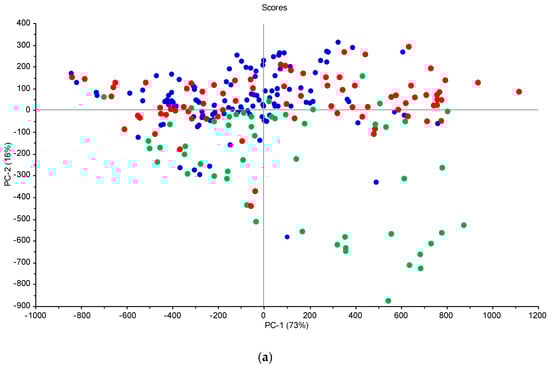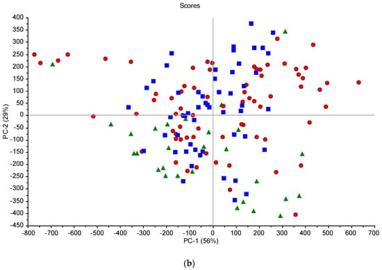 Score plots from the PCA analysis of the spectral data for the Górki (a) and Turno (b) sites—green circles/triangles, low moisture; red circles, average moisture; blue circles/squares, high moisture.