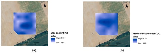 It has been demonstrated elsewhere [] that only satisfactory VIS-NIR models for SOC and Clay content could produce very precise maps at the field scale. Consequently, maps of C, N and clay contents were generated here for some of the more robust models. The maps (Figure 6) are overall similar, as can be seen in Figure 7, and the differences in spatial distribution between predicted and measured values are presented, roughly providing an idea of the variation of C, N and clay content in the investigated area. These maps are probably not precise enough to be used for precision agriculture, but they do provide a fast overview of the field characteristics.