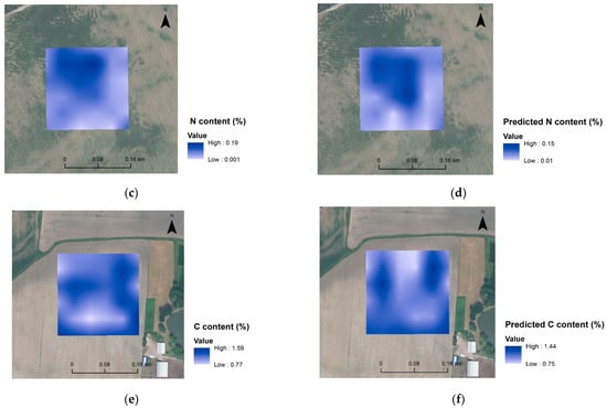 Spatial distribution maps of analysed clay content (a) and predicted clay content (b) for Czesławice; analysed N content (c) and predicted N content (d) for Górki, and analysed C content (e) and predicted C content (f) for Osiny.