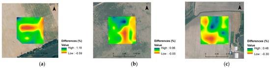 Spatial distribution maps of differences between predicted and measured clay content (a) for Czesławice, N content for Górki (b), and C content (c) for Osiny.