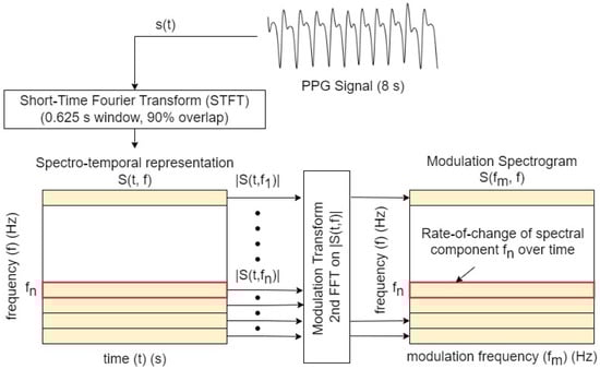 The signal processing steps involved in the computation of the modulation spectrogram are depicted in Figure 1. First, the signal is transformed to the time–frequency domain (spectrogram) via the short-time Fourier transform (STFT) (here, implemented using a 0.625 s moving window with 90% overlap). The choice of window size was made empirically based on initial experiments on clean PPGs.