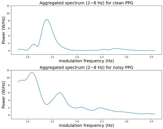 The proposed SQIs are motivated by the fact that the spectral shape of the aggregated modulation spectrogram across conventional frequency is very different for clean and noisy PPGs. Figure 3 shows the modulation spectrum aggregated over conventional frequencies between 2 and 8 Hz from the modulation spectrograms in Figure 2b,d, respectively. We can see that the clean aggregated spectrum has one clear spectral peak while the noisy spectrum has multiple peaks in comparison.