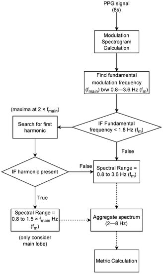 The processing steps to compute the proposed SQI measures are summarized in the diagram shown in Figure 4. First, the modulation spectrogram is calculated over the 8 s signal window. Following this, the modulation frequency corresponding to the fundamental lobe () is calculated by locating the modulation frequency corresponding to the maximum of the aggregated spectrum along the conventional frequency axis between 2 to 8 Hz. The range 2 to 8 Hz was chosen for aggregation as most of the signal information lies within this region []. The corresponds to heart rate for a clean signal but can be arbitrary for noisy signals. If no harmonics of the signal exist in the considered range of modulation frequencies, the full spectral range between 0.8–3.6 Hz (48–216 bpm) can be used for aggregation. Otherwise, we look for the first harmonic, and in case it exists, we use a smaller spectral range between and Hz so that only the main lobe is considered for calculation. A harmonic will only exist if the is greater than half the maximum modulation frequency considered (i.e., 3.6 Hz, 216 bpm) and has a harmonic spectral peak at . Finally, three spectral descriptors of the aggregated spectrum are calculated in the specified range.