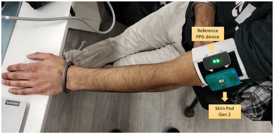 Data using this protocol were collected from eight participants. A balance between male and female participants was maintained and participants with different skin colour tones and varying blood pressure (BP) levels were invited to participate, as these are factors known to impact PPG quality []. Experiments were performed in line with the Helsinki declaration and the participants consented to participating. The study protocol was described to the participants in detail and they consented to participate and were allowed to cease participation anytime without providing any reason. The Skiin pod was used to measure continuous green, red, and infrared PPG from the arm. A reference continuous PPG monitor was placed next to the Skiin Pod (shown in Figure 5). The positions of the reference device and Skiin Pod were counterbalanced for each subject. Only the PPG data collected using the Skiin pod during the protocol were used herein.
