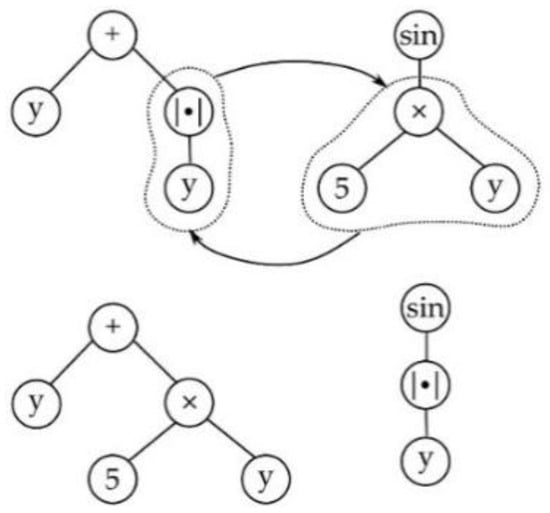 Genetic programming is an evolutionary algorithm that is able to synthesize programs and was developed as an offshoot of genetic algorithms in the 1990s by Koza []. One of the important applications of genetic programming has been symbolic regression in which the aim is to identify a mathematical expression that best fits an input–output dataset. In traditional genetic programming, an individual is represented by an abstract syntax tree (AST) whose offspring, obtained by undergoing a variation operation, passes on to the next generation. Different variants of genetic programming have developed, such as multi-dimensional genetic programming, where an individual is composed of different subprograms such as in multi-gene genetic programming [], linear genetic programming [], grammatical evolution [], Keizen programming [], etc.