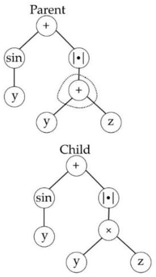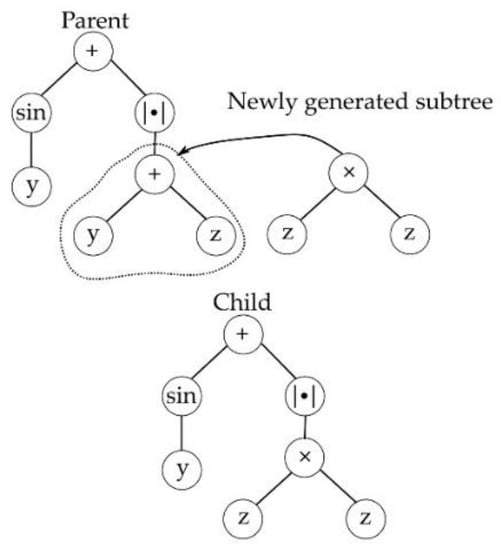 Selection in MGGP occurs in two stages, at first a parent is selected based on the individual’s fitness, then a gene within the parent is selected at random. Once the gene is selected, it undergoes one of four variation operators: subtree crossover, high-level crossover [], subtree mutation, and point mutation as shown in Figure 1, Figure 2, Figure 3 and Figure 4. GPTIPS2 [] an MGGP toolbox for MATLAB is used to obtain the model.