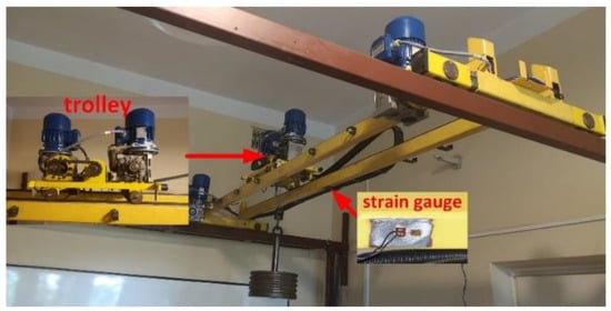 Strain gauge sensors are used in a variety of crane applications. Strain-gauge-based methods are applied to fatigue life prediction of existing crane runway girders and to evaluate the residual operating life of a bridge crane girder [,,]. A combination of strain-gauge measurement and finite element analysis is used to identify crane wheel load for a quay ship-to-shore crane []. Strain sensing is used to identify the occurrence and intensity of the overhead crane skewing [] and in the new technique of payload sway angle measurement [].